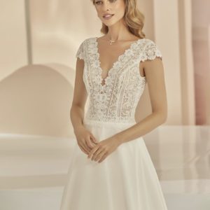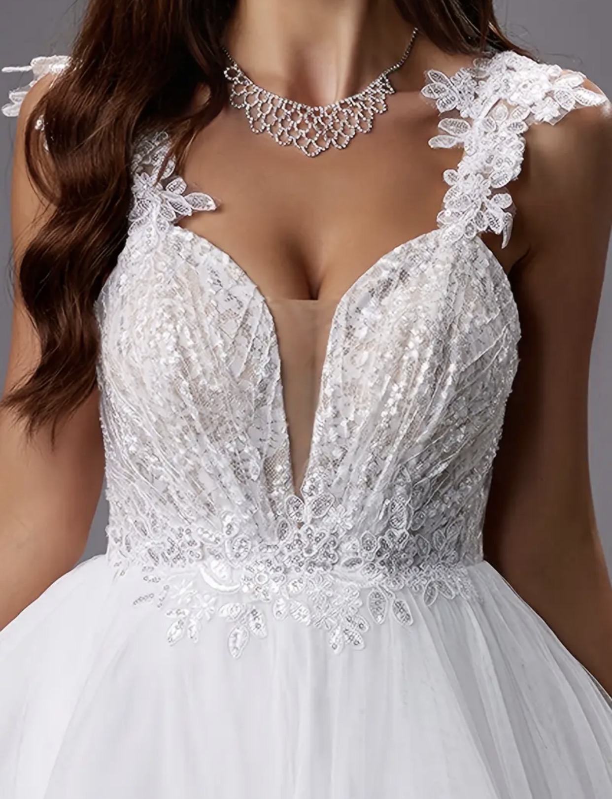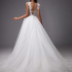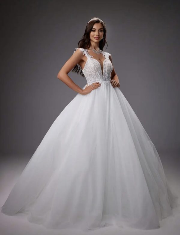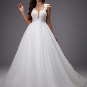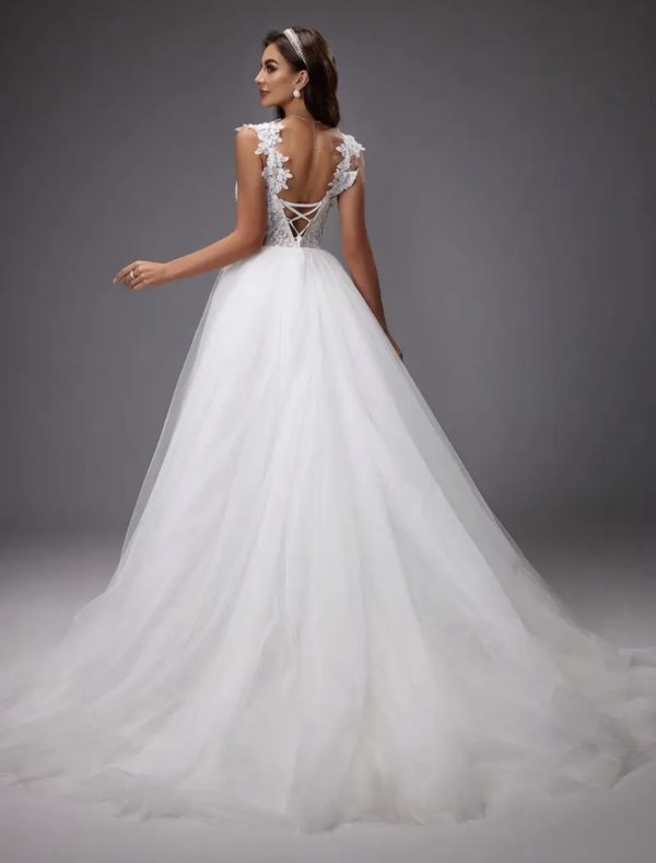 Robe de mariée princesse au charme romantique. Le corsage en dentelle finement brodée et perles scintillantes sublime un décolleté profond avec tulle transparent. Les bretelles ornées de fleurs délicates et le dos nu à laçage apportent une touche de féminité et d’élégance. Sa jupe en tulle vaporeux forme une belle traîne fluide, parfaite pour un look majestueux et raffiné.