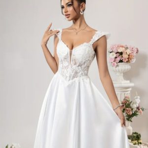 Le haut en dentelle délicate met en valeur un décolleté en cœur raffiné et des bretelles légères. Le dos en V profond souligne la féminité avec des boutons recouverts pour une touche romantique. La jupe longue en satin fluide offre un tombé majestueux et un mouvement naturel à chaque pas.